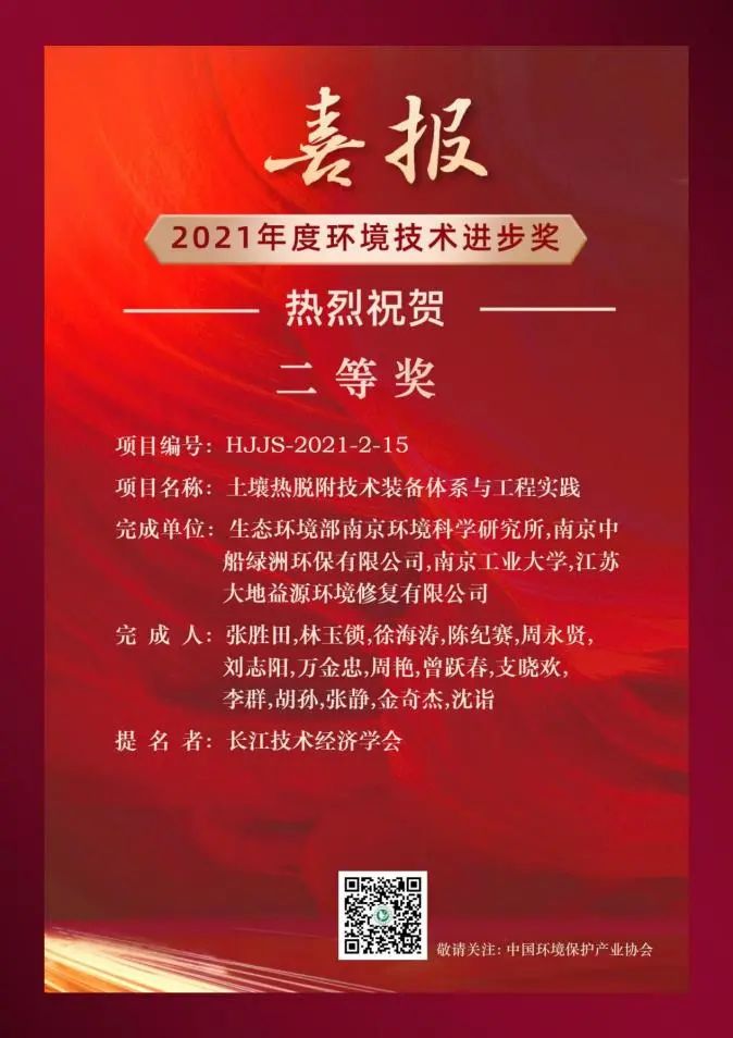 近日,中国环保产业协会发布公告,大地益源参与建设的土壤热脱附技术装备体系与工程实践项目,经长江经济技术学会提名,荣获2021年度环境技术进步二等奖。